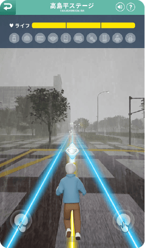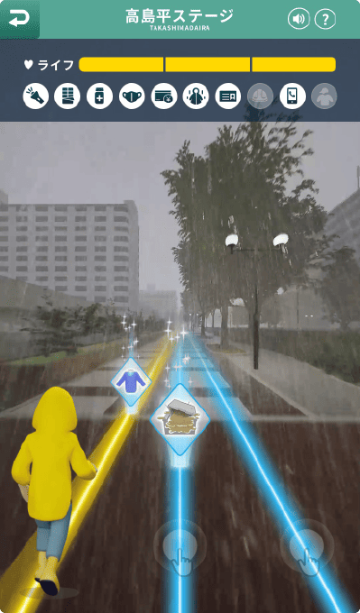 雨の中、防災用品を集めながら避難場所を目指します。危険なものを避け、無事に避難所にたどり着けるか? 瞬発力を鍛えながら、防災用品について楽しく学びましょう。