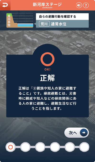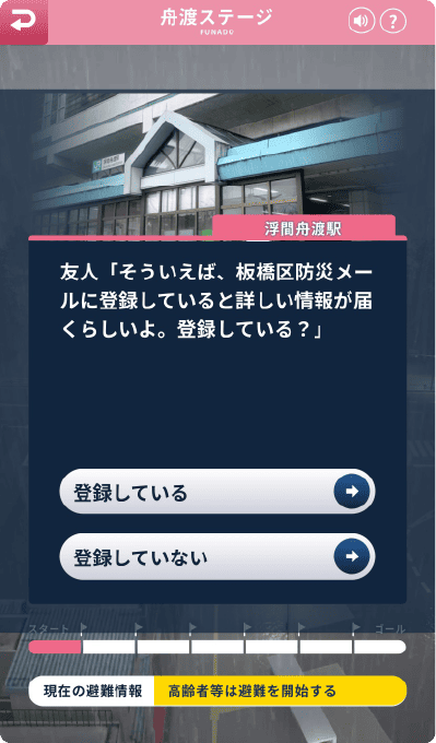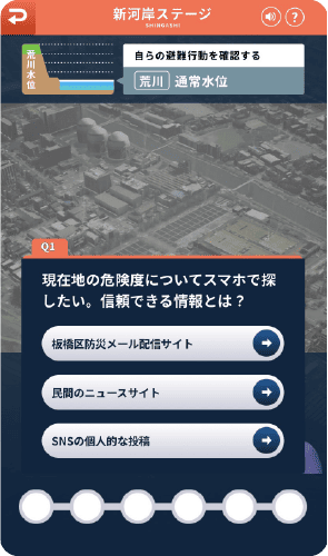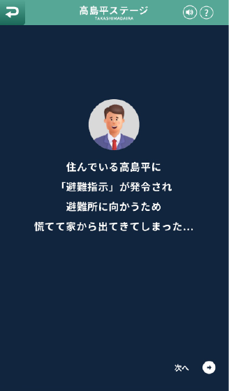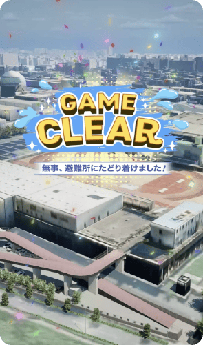 大雨の中、大規模な水害が発生する可能性が…!3択式のクイズに答えて、避難場所を目指します。クイズはランダムで出題されるので、ゲームクリア後も繰り返しトライして理解を深めましょう。